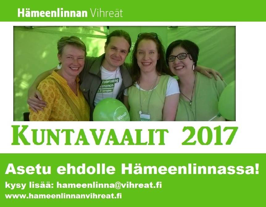 Eduskuntavaaleissa hyvin menestyneet Vihreät lähtevät kuntavaaleihin hienossa nosteessa. Hämeenlinnan Vihreät nimesi kevätkokouksessaan 4.4.2016 ensimmäiset kuntavaaliehdokkaansa: Leena Aarnipuu, Teppo Heiskanen, Arja Luukkonen, Kirsi Ojansuu-Kaunisto, Airi Raitaranta, Merja Saarinen, Andrei Sergejeff, Päivi Sieppi, Mirka Soinikoski, Martti Töttölä, Ville Vihriälä ja Marjo Väre.